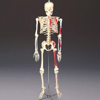 This life-size skeleton has muscle insertions and origins painted on the left side of the skeleton and numbers of important features on the right side. Calvarium is cut with moveable jaw mounted on springs. Arms, legs and skull are removable. Stand and keycard included. Size: 5' 6" tall. Weight: 23 lbs.